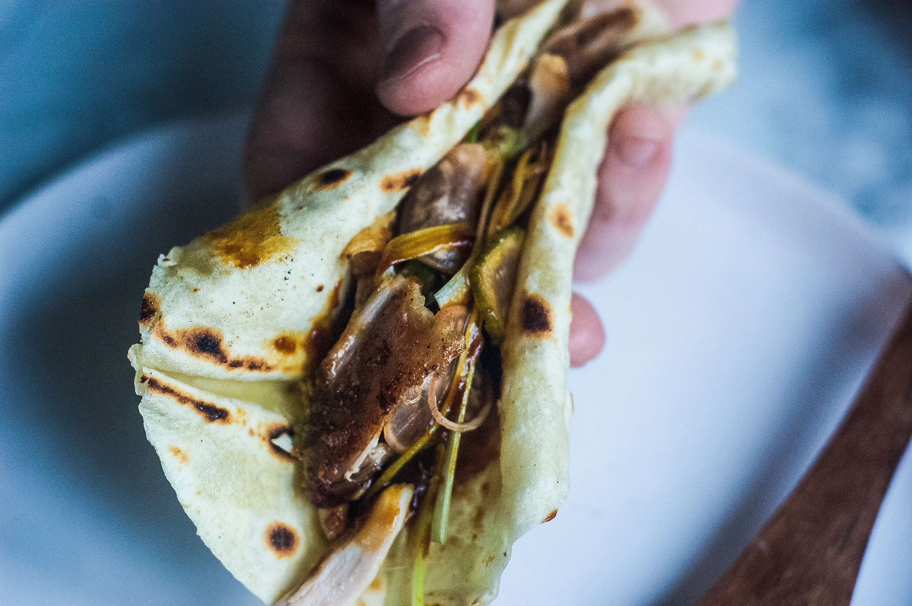Heat a heavy bottomed skillet and add a drop of oil to coat. Peel your pancakes apart (it’s easier than you’d think!). Cook your pancake on one side until its brown and bubbling (about 1 minute) and then flip. The second side will cook faster so make sure to keep an eye out! Keep your cooked pancakes under a damp cloth until serving. You can make these in advance and then steam them to reheat before serving.