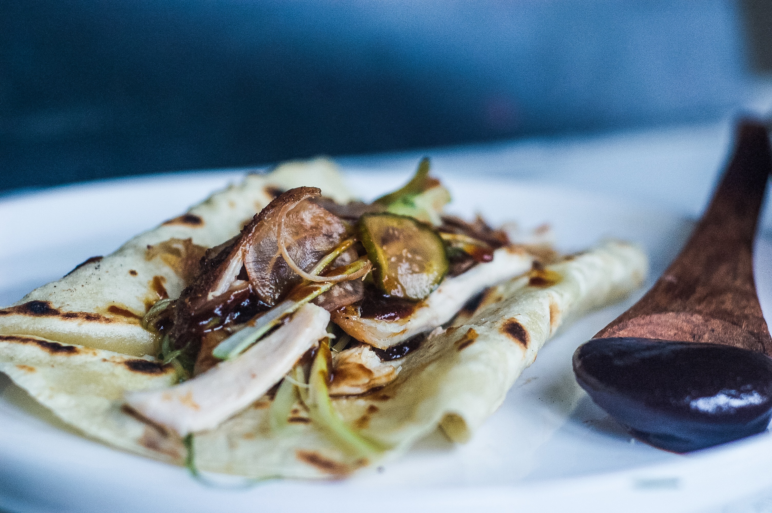 To serve, take a pancake, add a good helping of the duck and garnish with fresh cucumber,spring onion and for a bit of a kick the spicy pickles. Finish with a drizzle of hoisin sauce. If your hoisin is too thick, thin it out with a little water.